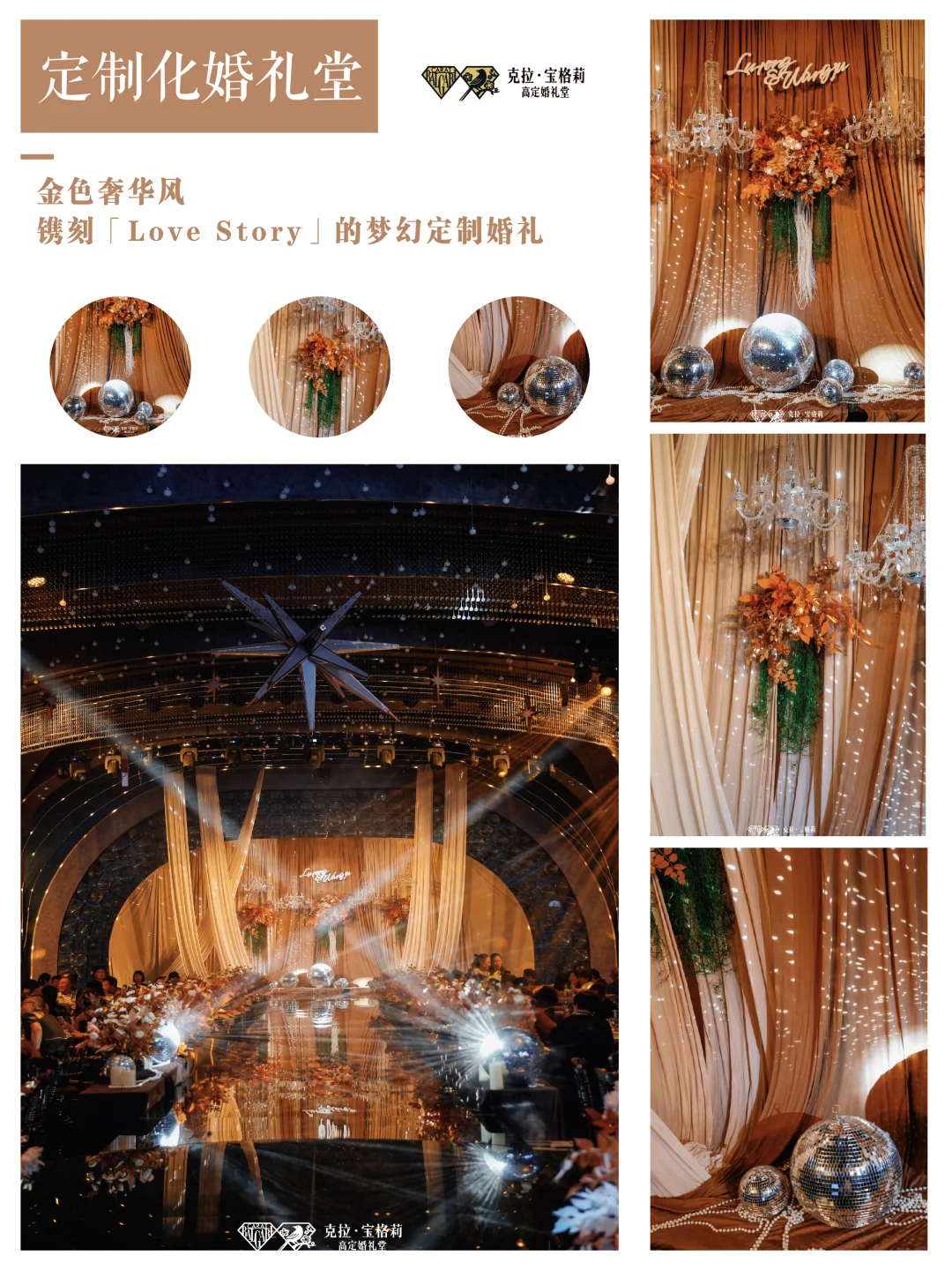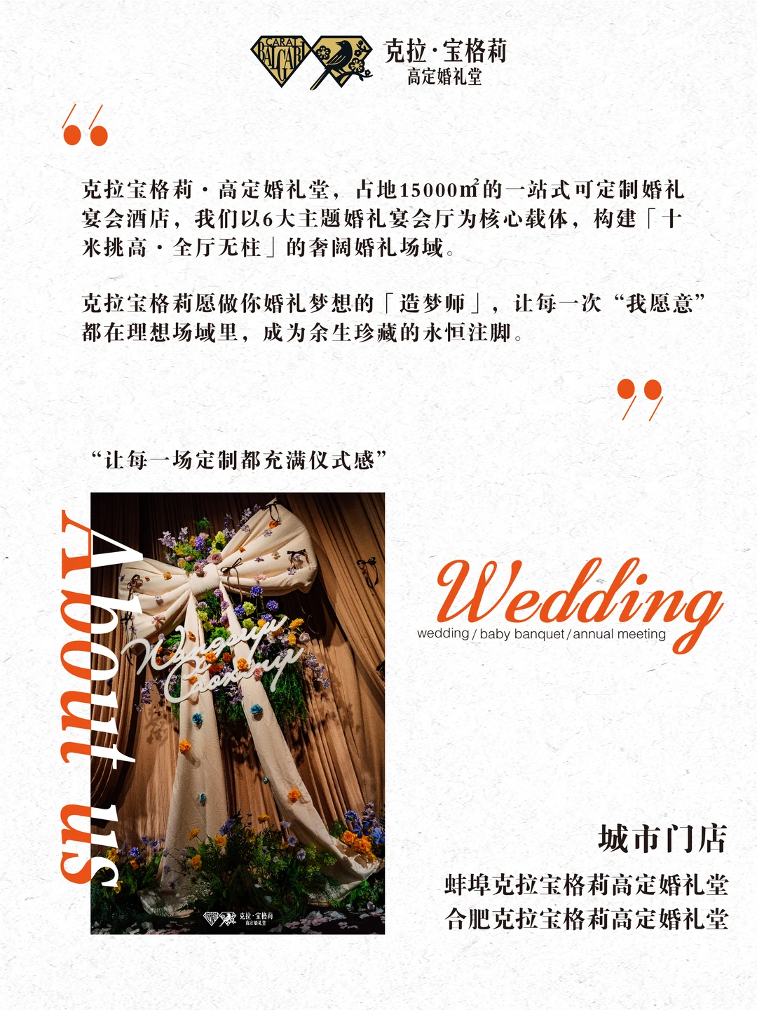 克拉宝格莉婚礼艺术中心,营业面积1.5万方,斥资近1个亿。 拥有大小12个明星级宴会厅,6个婚宴厅,6个宝宝宴会厅,10米层高,厅厅无柱,可接待婚宴、年会、商务酒会、宝宝宴、公司庆典等多类型宴会。
