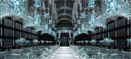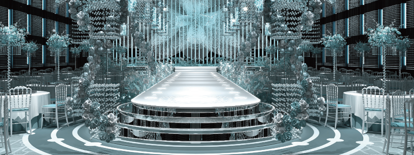 该宴会厅面积550平,可容纳22桌宾客。提芙尼蓝的神秘与深邃,水晶的晶莹与永恒,极致的线灯光,色彩的明暗对比,在一片斑斓璀璨的独特光芒里,打造一场低奢雅致的婚礼。