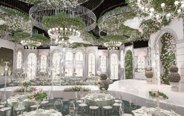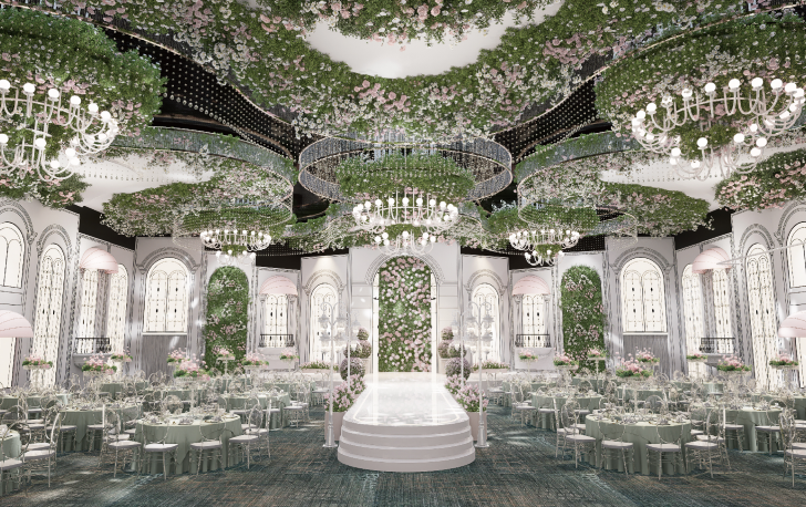 该宴会厅面积近680平,可容纳28桌宾客。整体设计灵感来源于浪漫的法式庄园,整体空间设计保留了香榭丽舍大街的橱窗元素,用现代时尚设计融入了古典建筑元素,呈现出优雅浪漫的空间美学。