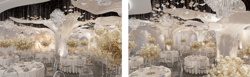 该宴会厅面积约500平,可容纳24桌宾客。在室内造出一片梦幻森林,聆听清晨万物苏醒的声音。在这片光影交错的世界里,每个人都可以成为自己故事的主角,编织着属于自己的月光森林之梦。