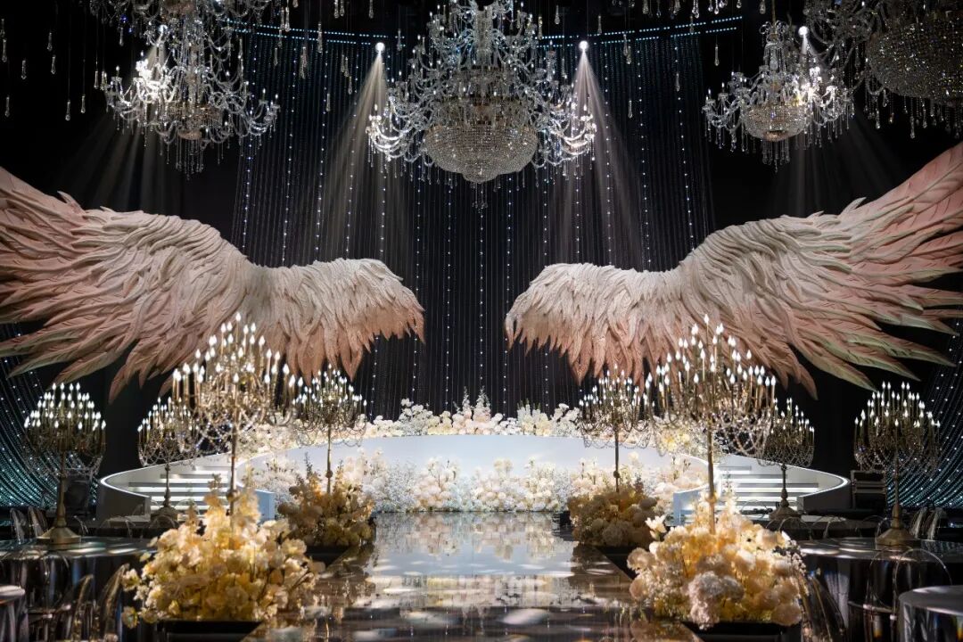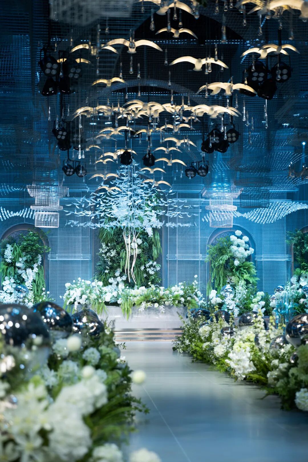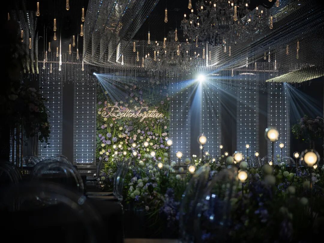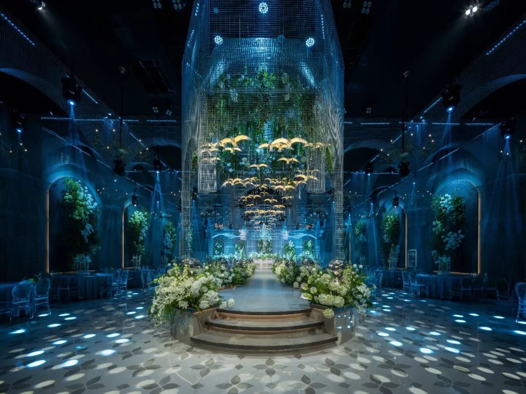 As the subtle light flickers on, it dances gracefully on the petals through the crystal prism, transforming the entire hall into the opening pages of a fairy tale. The crystal light array descends from the dome, resembling a river of stars pouring down onto the world. Dust swirls gently, and every step takes you deeper into the dreamland. In front of the vines-entwined vow wall, love grows silently, softly whispering about the eternal and fragrant promise.