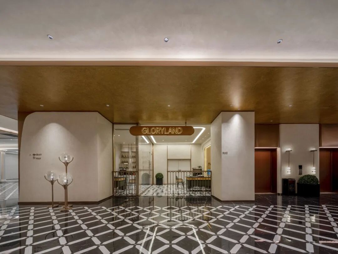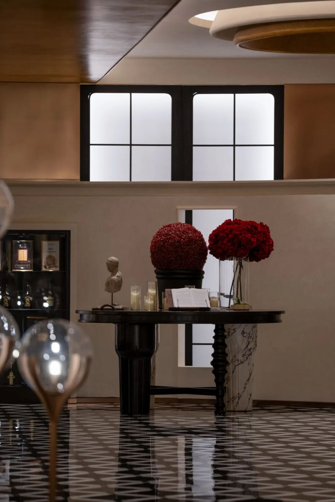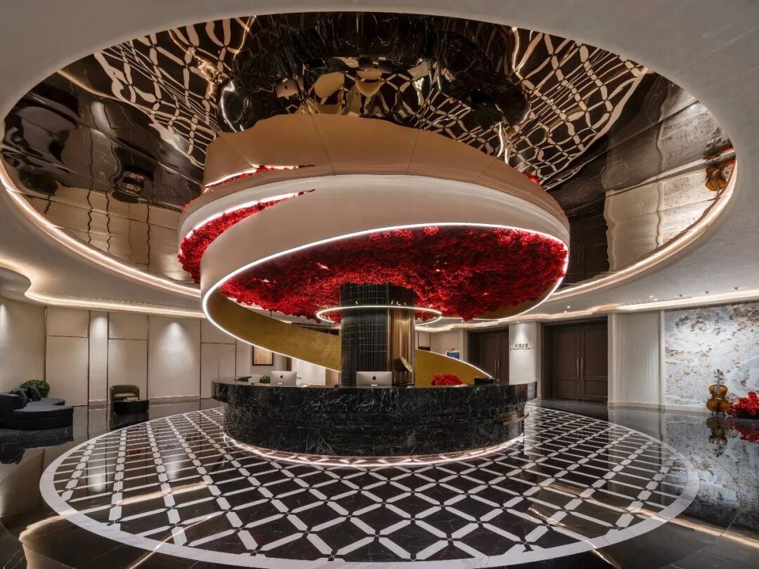 以穹顶之上流转的金色圆镜为核心,视线所及之处皆被温柔的光晕收束。纤细的镀金线条于墙面与天花间游走,宛如金箔绘制的无形旋律,在光与影的共舞中,构建出层层递进的视觉纵深。空间的主调铺陈经典的红金二色:深邃的丝绒红承载着温度的厚度,玫瑰的绯色在其间若隐若现,如一段段缄默的诗行;而鎏金则漫溢于各处细节,从穹顶的曲线、灯饰的脉络,直至地面隐约的纹样,赋予空间一种沉静的华贵。