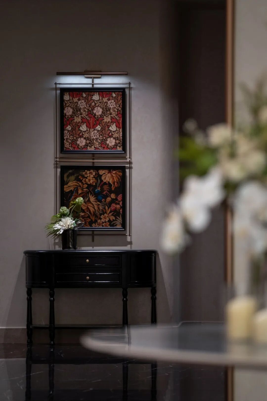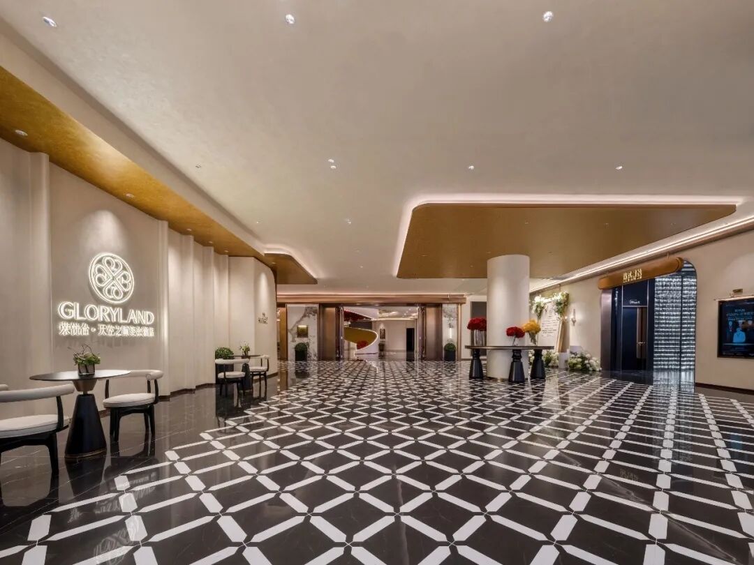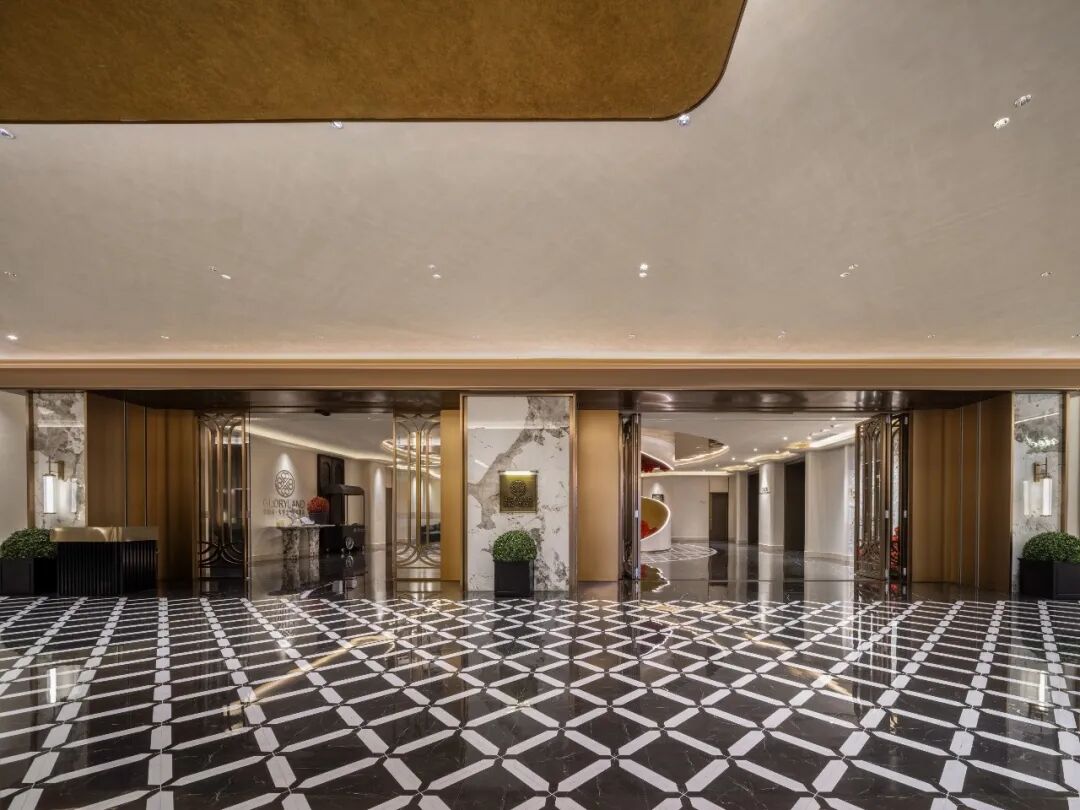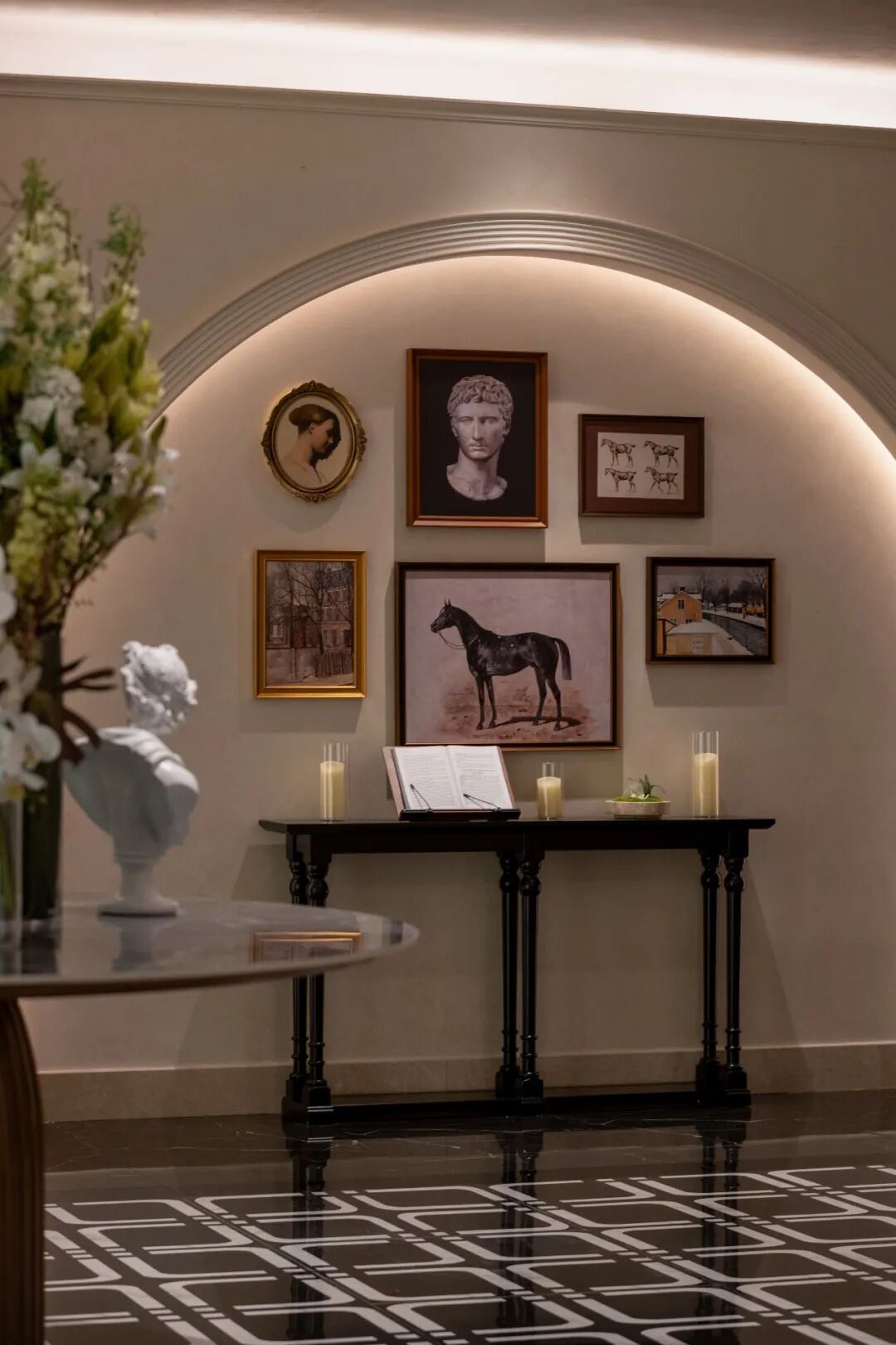 以穹顶之上流转的金色圆镜为核心,视线所及之处皆被温柔的光晕收束。纤细的镀金线条于墙面与天花间游走,宛如金箔绘制的无形旋律,在光与影的共舞中,构建出层层递进的视觉纵深。空间的主调铺陈经典的红金二色:深邃的丝绒红承载着温度的厚度,玫瑰的绯色在其间若隐若现,如一段段缄默的诗行;而鎏金则漫溢于各处细节,从穹顶的曲线、灯饰的脉络,直至地面隐约的纹样,赋予空间一种沉静的华贵。