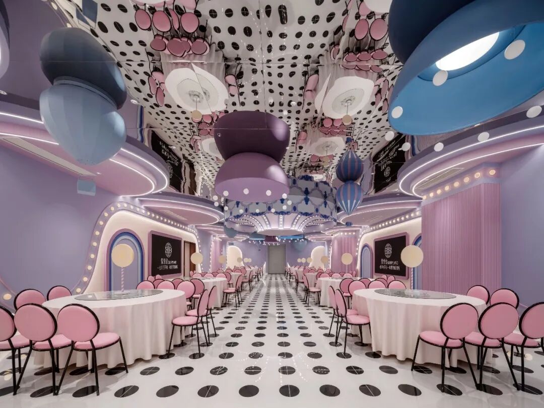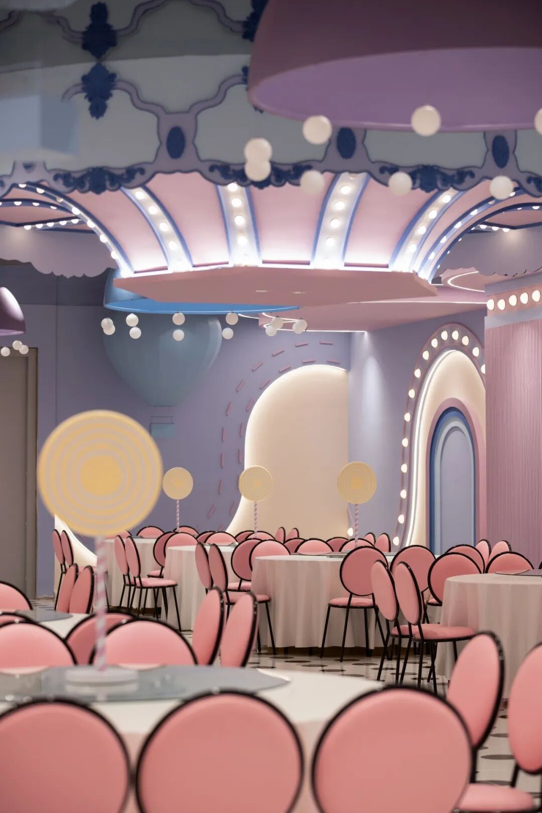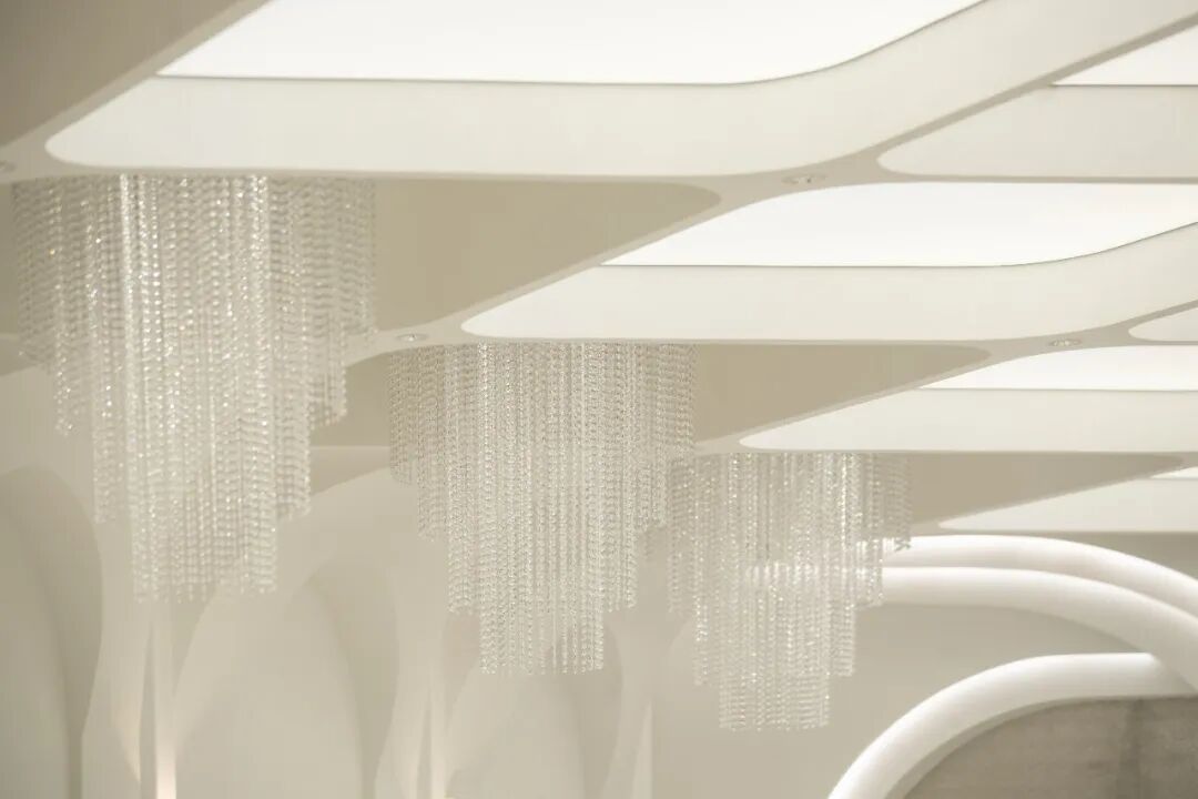 以一场蜃景为灵感的起点,琉璃般的蓝,在空间中晕染开一片悬浮的梦境。这并非遥不可及的海市蜃楼,而是一座可走入的浪漫幻城。踏过如浮于花海中的阶梯,光幕如潮汐般温柔退去。网格交织的穹顶之上,极光般的光色倏然绽放。