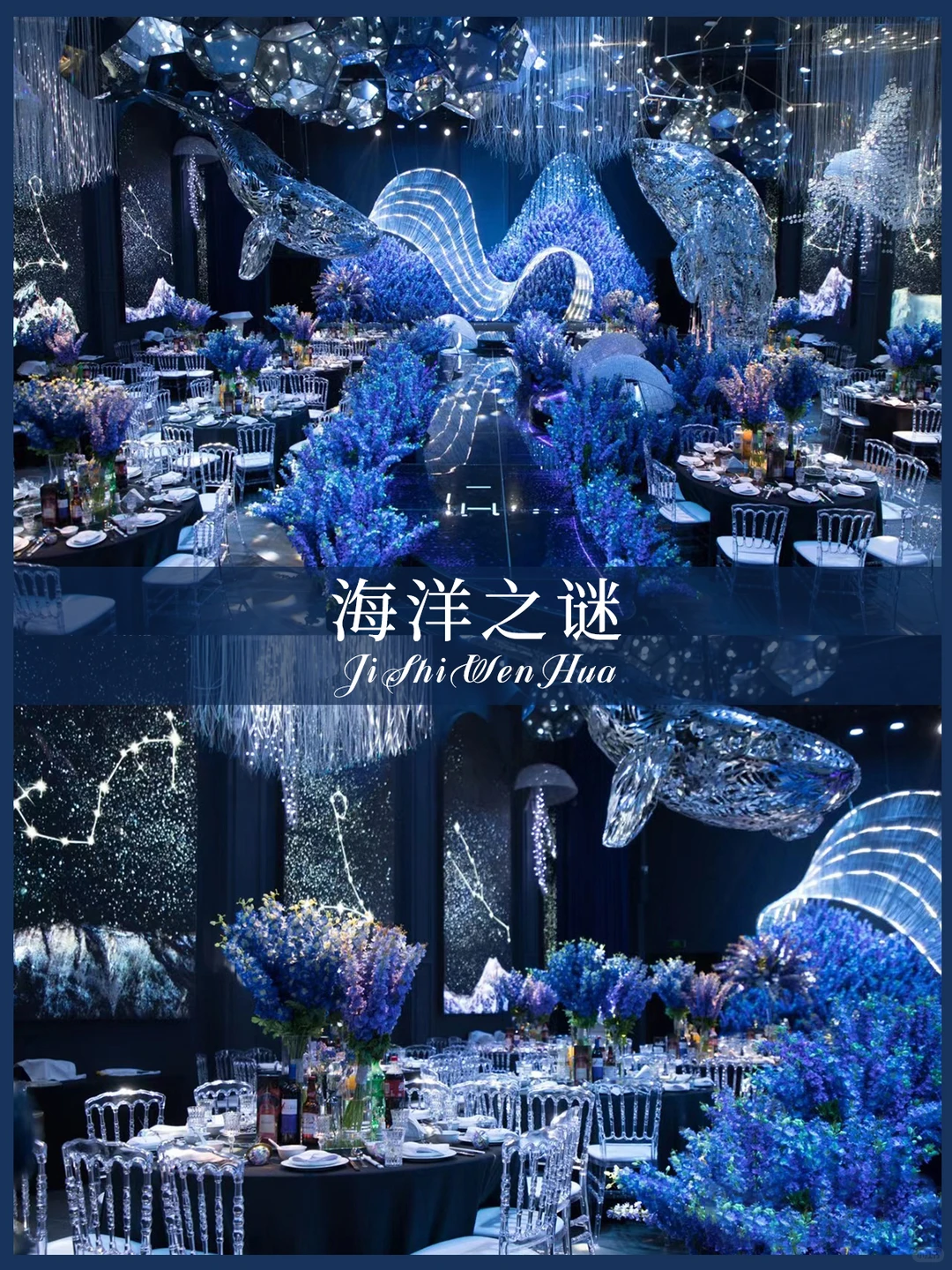 深蓝与银白交织,宛如潜入深海。巨大的鲸鱼雕塑悬浮于空中,灯光洒下,仿佛游弋于星河。