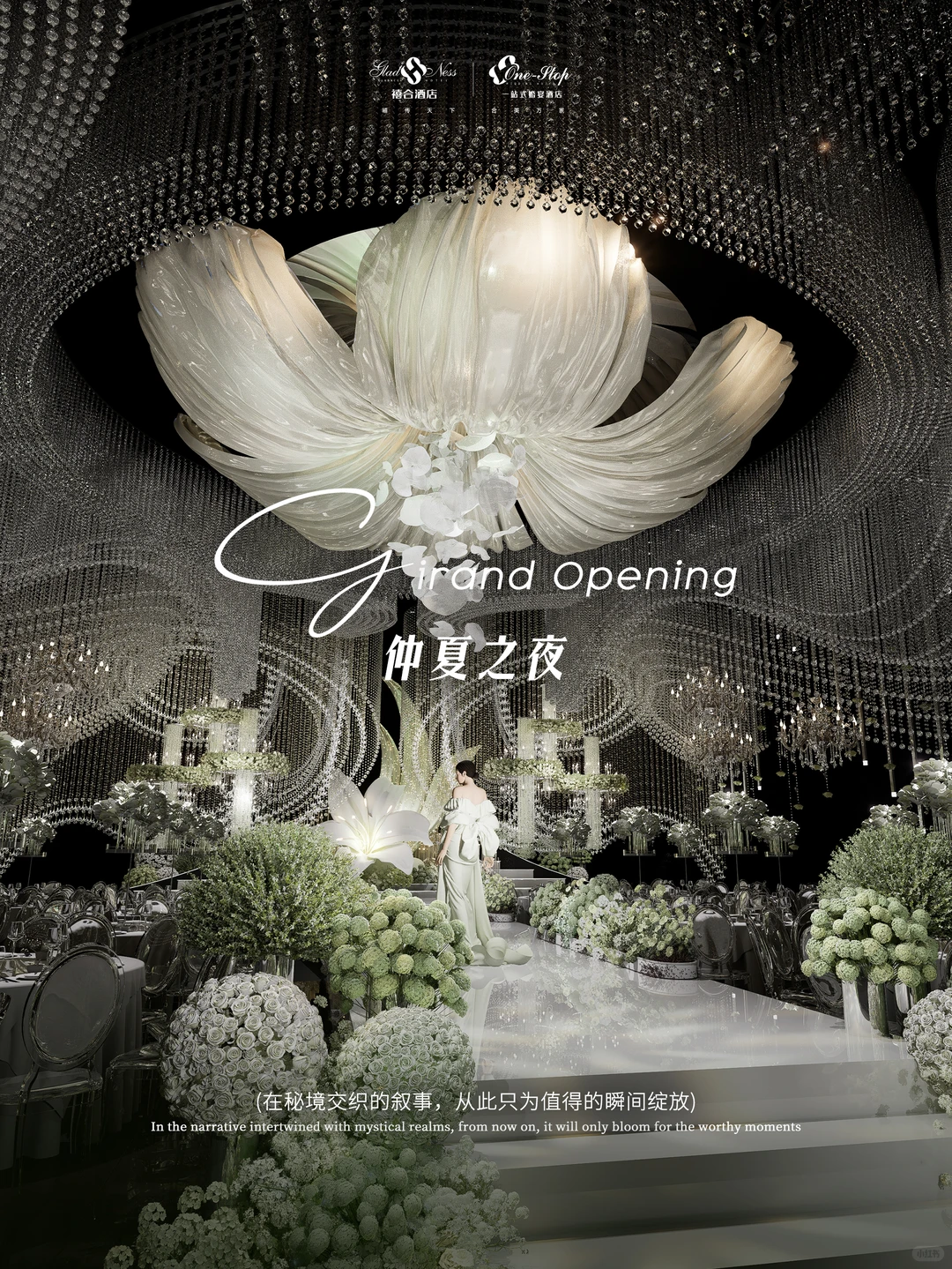 数千颗水晶如星瀑垂落 两侧花径在裙边绽放
