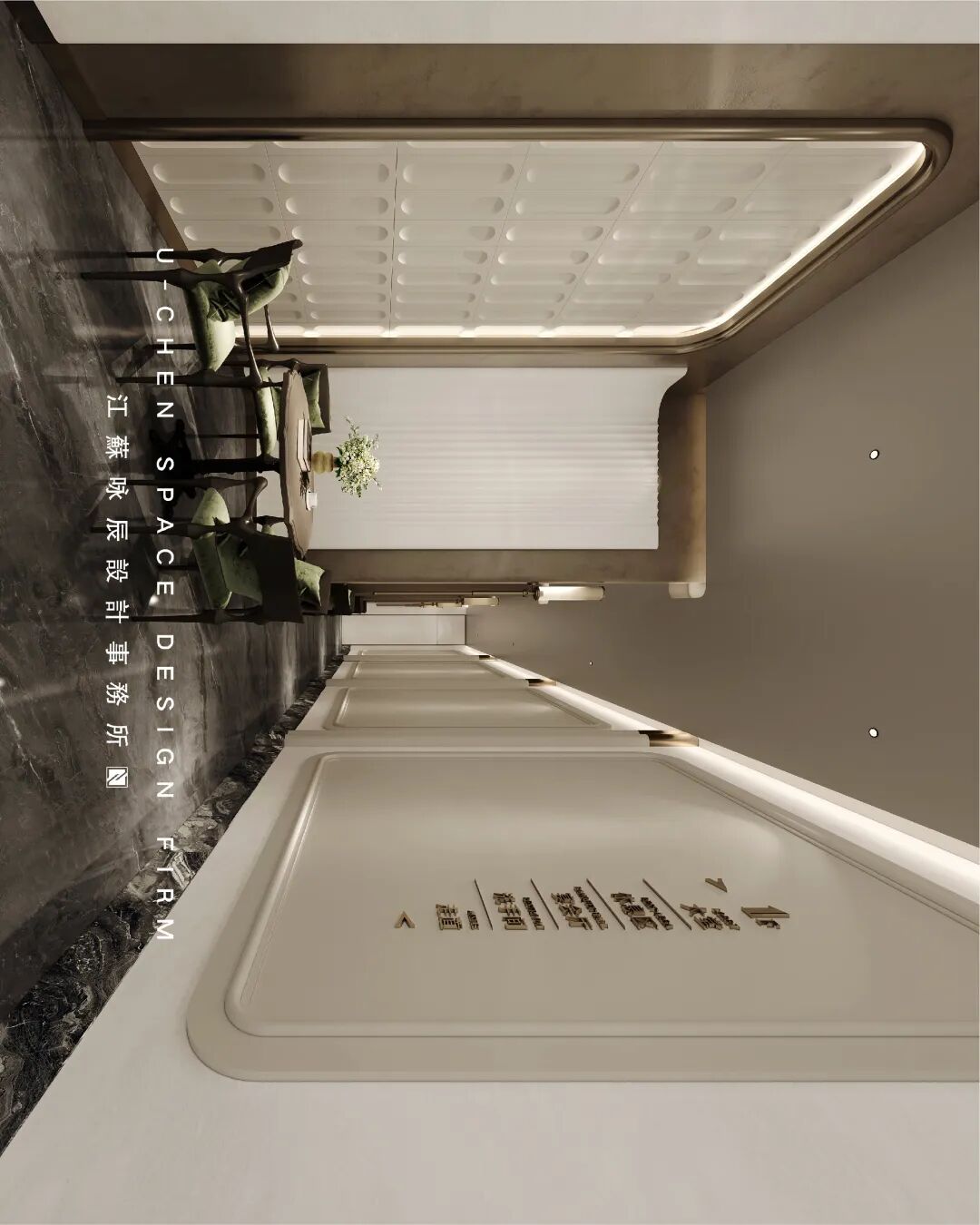 江蘇咏辰設計事務提炼出体块关系和清晰的线性语言为核心。挑高空间与对称布局奠定大气基调;大面竖条纹格栅墙与几何拼花地面强化纵向延伸感与现代秩序。材质上,温润青玉石材与冷峻金属形成质感对话,香槟金细节点缀于栏杆、收边等处,于简约中勾勒意式轻奢气质。整体摒弃繁复装饰,依靠比例、光影与材质对比,营造出兼具高端商务质感与现代艺术格调的静谧空间氛围。