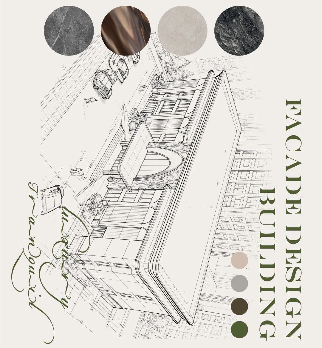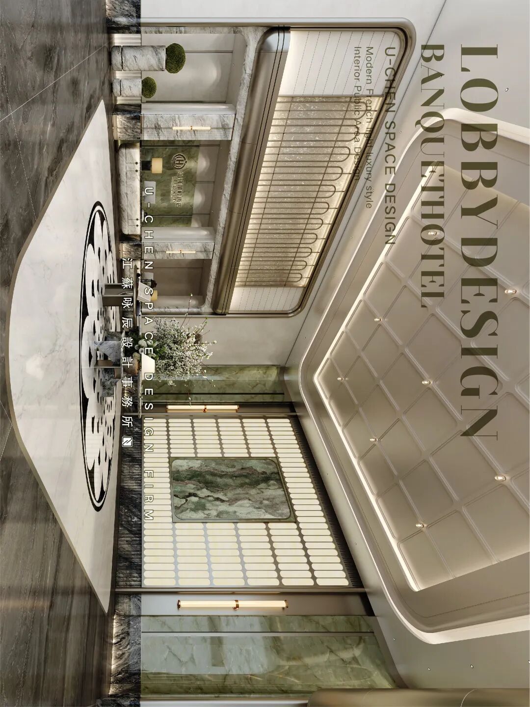 As the elegant beginning of the banquet experience, this prologue hall establishes the overall tone of the space with a modern French light luxury style. The symmetrical and rigorous layout highlights a sense of ceremony, with warm beige toned walls and dark gray flooring creating a soothing and sophisticated contrast. The smooth curved ceiling is embd a humanistic atmosphere, while the open top cabinet doors and hollow partitions ensure functionality while maintaining visual continuity and transparency. The green plants and marble flower bowls embellish the exquisite space, injecting natural vitality and creating a delicate, romantic, and artistic transitional space, quietly embarking on an unforgettable banquet journey.