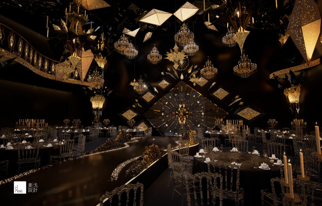 新娘入场的门并非传统意义上的门体,而是一面巨大的菱形水晶造型装置。材质选用亚克力与镜面复合结构,配合隐藏式线性灯光,在开启瞬间呈现璀璨光芒。菱形造型锐利而规整,传达出高贵、现代且极具仪式感的第一印象。二层楼座区位于宴会厅两侧的上空,栏杆用反光材质饰以钻石花纹,形成通透而华丽的花纹阵列,在光线照射下产生明暗交替的节奏感。反光材质同时将下方的T台与吊顶光线反射至二层,消除了楼层之间的视觉断层。 不堆砌:吊顶部分是整个宴会厅纵向尺度的最终收束点。从下仰望时,吊灯本身已具备晶石的几何形状。更关键的是,当视野放大抵达最顶部的天花基底时,发光花纹与吊灯的外轮廓恰好叠加,共同组成一个完整而华丽的晶石切割面。吊顶区域均匀散布多个简化版的小型水晶吊灯,大灯与小灯之间形成主次分明、疏密有致的阵列关系,使整个天花区域在垂直方向上呈现从“繁复”到“规整”的层次递进。舞台区域被塑造成整座宫殿的核心——只为新人加冕的仪式舞台。整体营造恢宏感,高反光材质打造的拱门,表面雕刻华丽的几何花纹。此时,这里不仅仅是一场婚礼的布景,更是一位女王加冕的舞台。