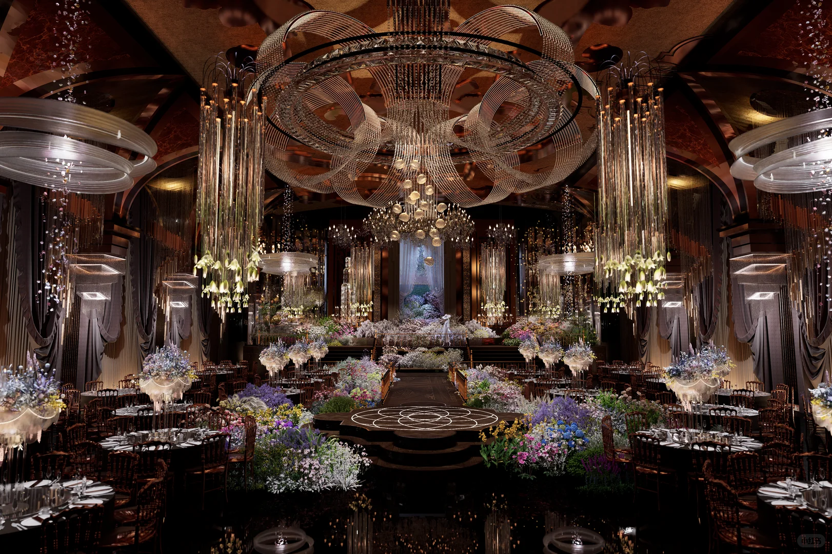 整个宴会厅用深邃的色彩打底,悬空而存的顶部装置以对称的飘带造型无限延伸,当简约的几何线条与流转的光影相互碰撞,就如同星光汇聚成银河,呈现出璀璨而夺目的光彩。