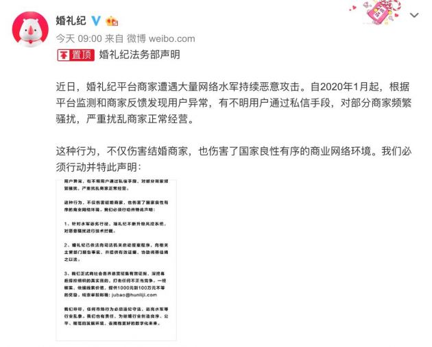 声明中提到,自2020年1月起,根据平台监测和商家反馈发现用户异常,有不明用户通过私信手段,对部分商家频繁骚扰,严重扰乱商家正常经营。“这种行为,不仅伤害结婚商家,也伤害了国家良性有序的商业网络环境。”