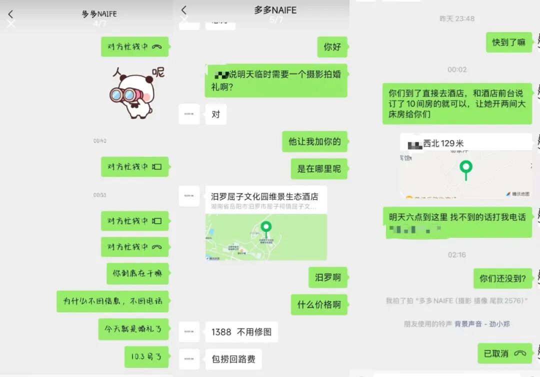 然而午夜过后,该摄影师突然失联,消息不回、电话关机。在失联前,“多多”曾向部分客户发送消息,称“路上出了点事,过不去了我这边可以给你赔付”。