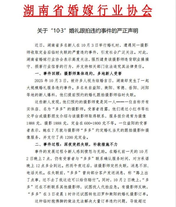 近日,湖南省多名新人在10月3日举行婚礼时,遭遇同一摄影师收取定金后临时失联的严重违约事件,引发社会广泛关注。