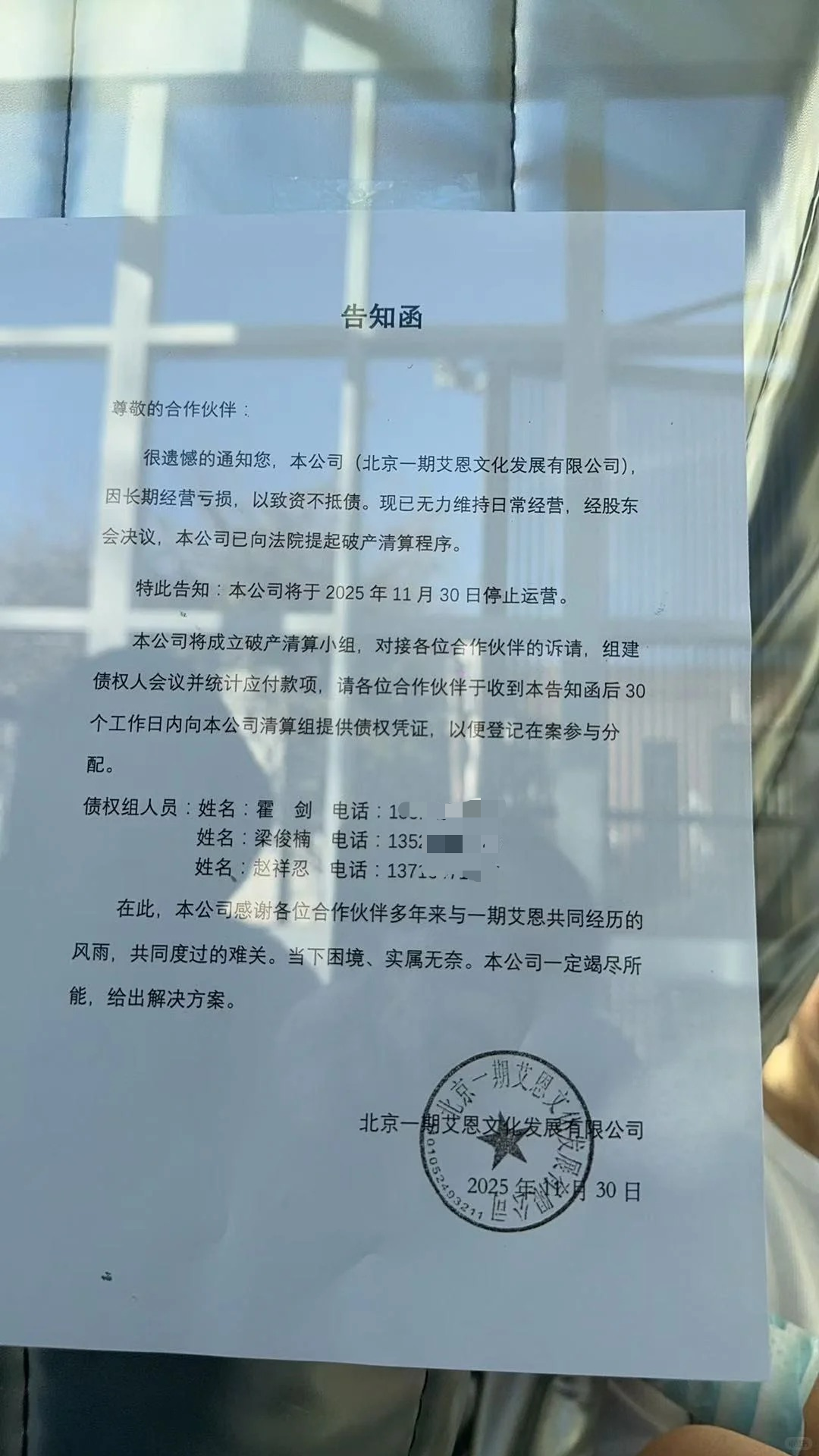 很遗憾的通知您,本公司(北京一期艾恩文化发展有限公司)因长期经营亏损,以致资不抵债。现已无力维持日常经营,经股东会决议,本公司已向法院提起破产清算程序。