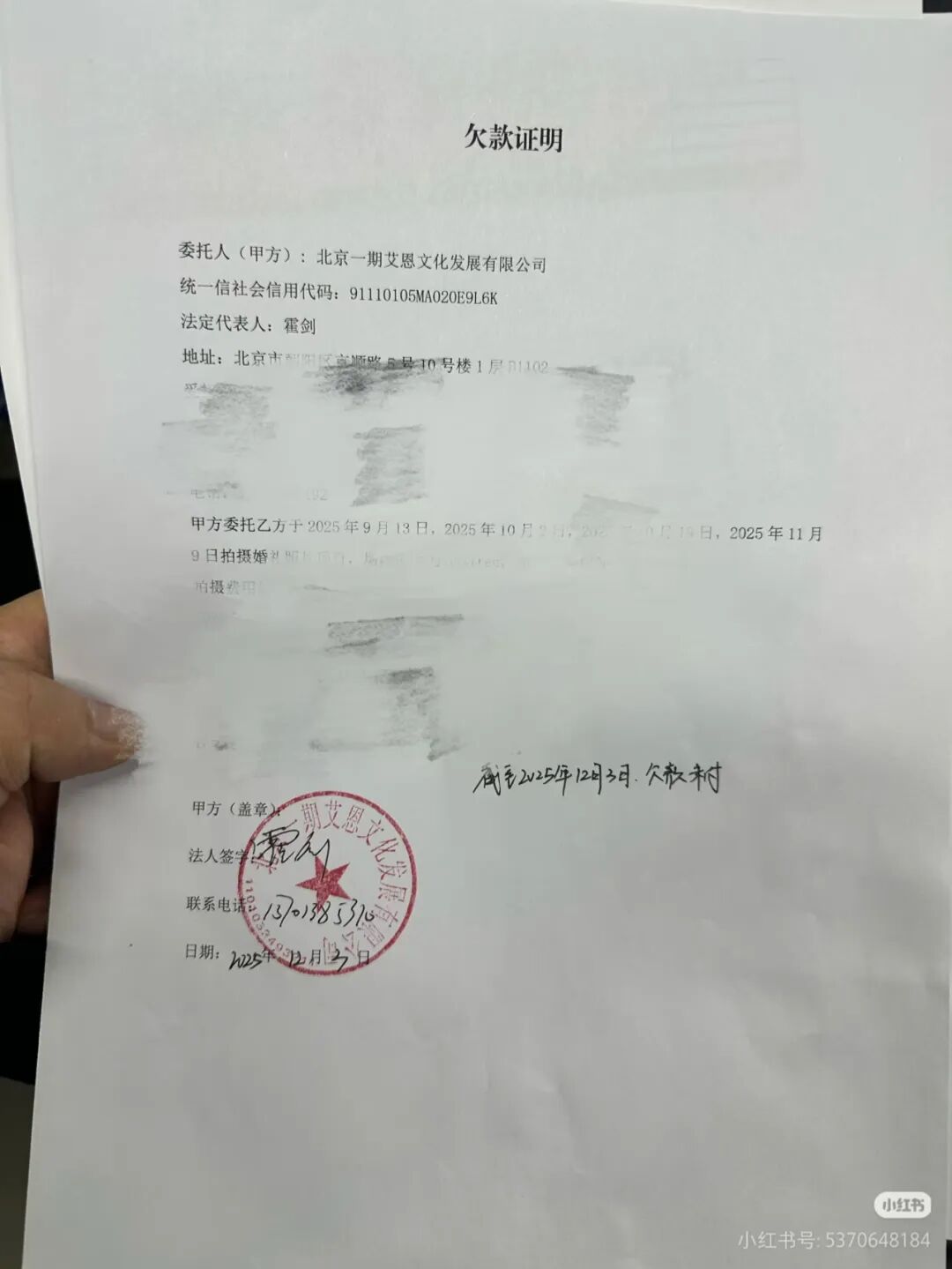 此外,已有新人及四大金刚通过社交平台公开发声,控诉艾恩婚礼不仅拖欠婚礼影像成片交付,更存在款项久拖不结的情况。