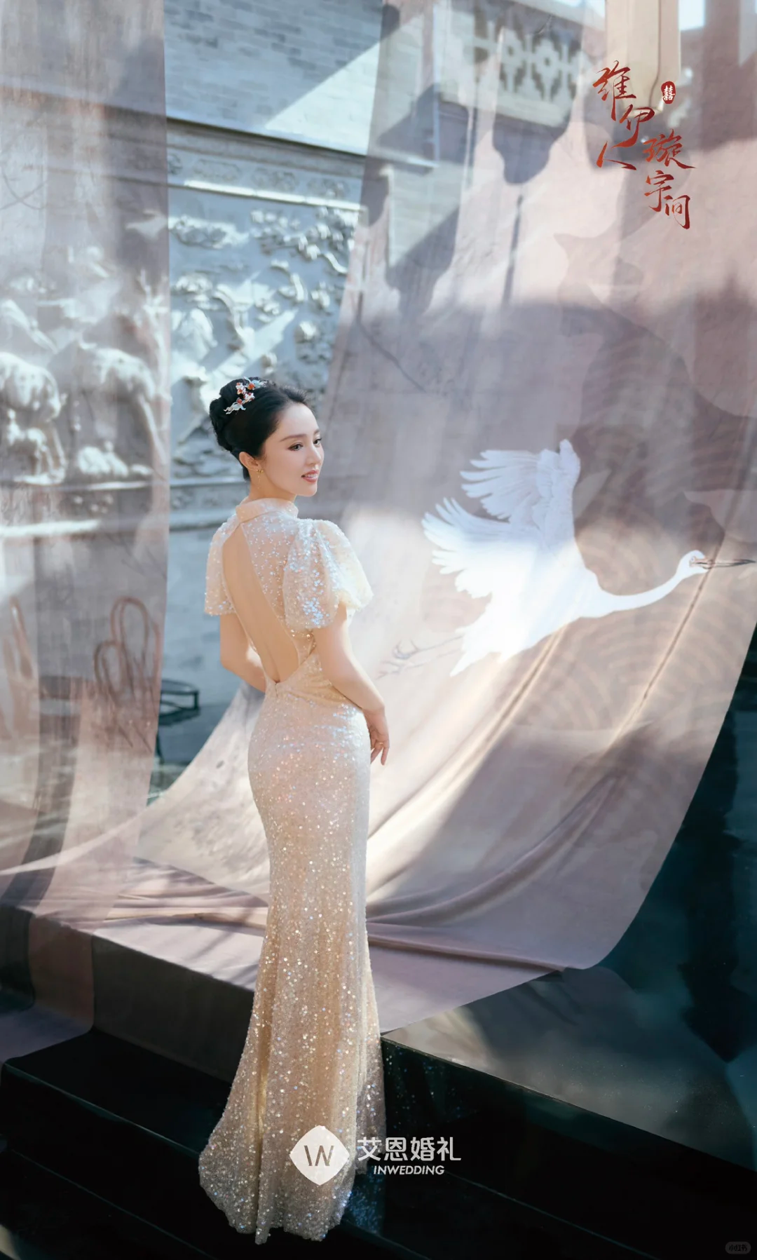 许玮甯的的头纱是由外婆1950年的嫁衣改制而来,衬着她精致而深邃的脸,映着她雪白的肌肤,在灯光下美得让人恍神。