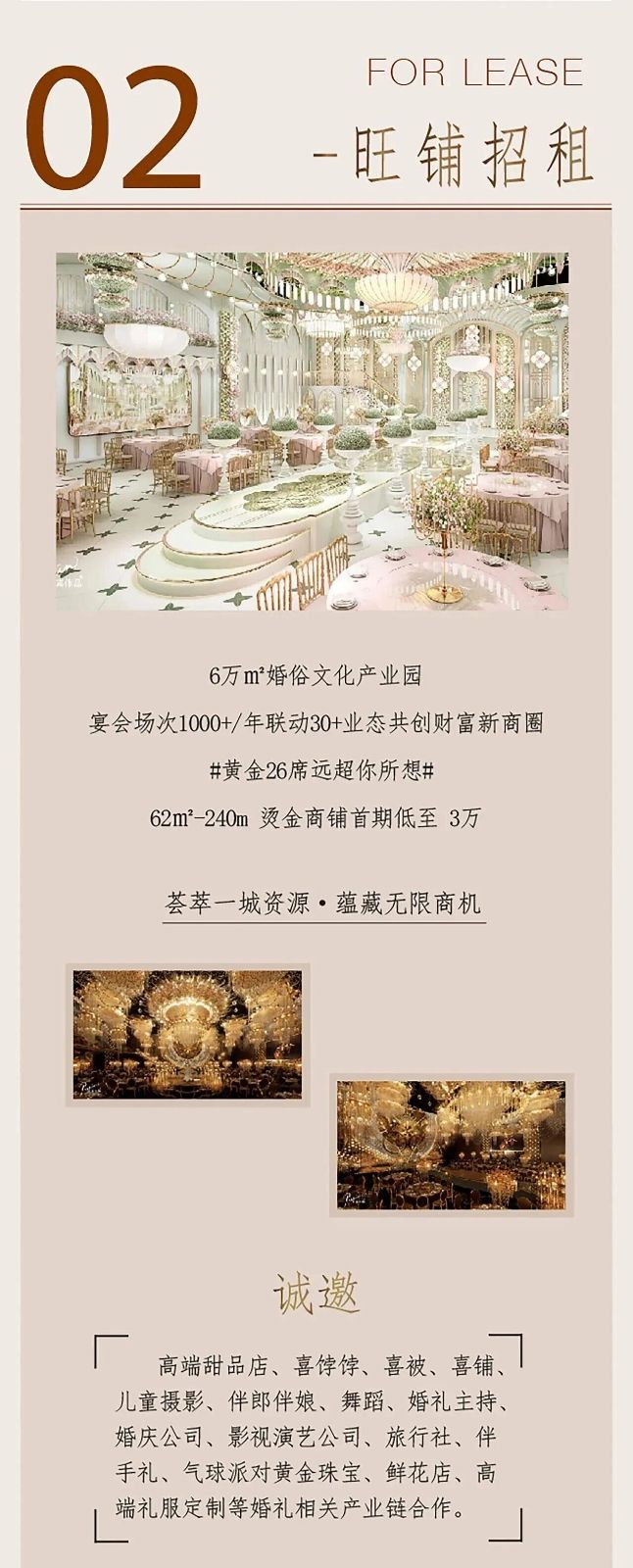 项目拥有24个无柱主题宴会厅、2个仪式堂、户外婚礼场地及单身俱乐部等多种功能区域,涵盖从相亲、订婚、婚礼到宝宝宴的全周期服务。