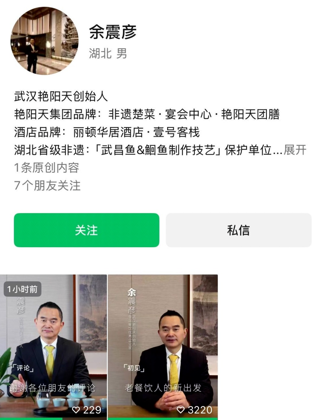 “大家好,我是艳阳天酒家的创始人余震彦。这是我第一次拍短视频,也是我这个70后的老武汉正式上场了,踏上了自媒体之路。”