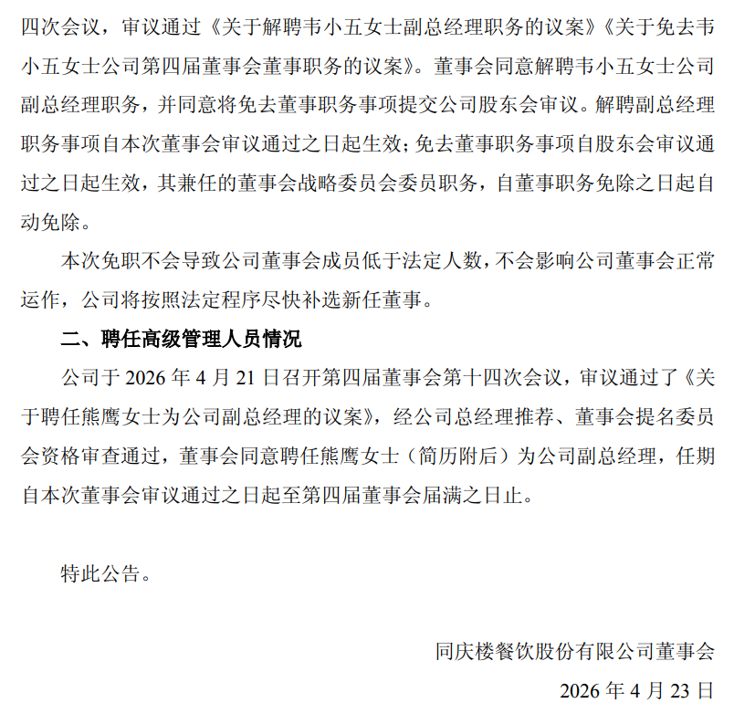 截至发稿,韦小五副总经理职务已被董事会解聘,但其劳动关系并未解除,董事职务仍保留,需等待股东会审议表决结果。董事会已选举熊鹰为新任副总经理,但同庆楼方面明确,熊鹰并非接替韦小五的婚礼宴会业务,“熊鹰主要负责公司拓展部,包括选址、开店等事项,与宴会板块不同,不负责经营。”公司表示,婚礼宴会板块“有相应人员承接,不会出现无人负责的情况”。