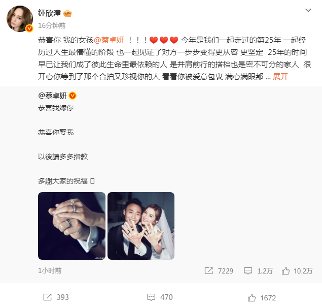 知名歌手蔡卓妍,宣布结婚并晒出结婚照。消息发出后,钟欣潼转发推文并祝福蔡卓妍:恭喜你,我的女孩。